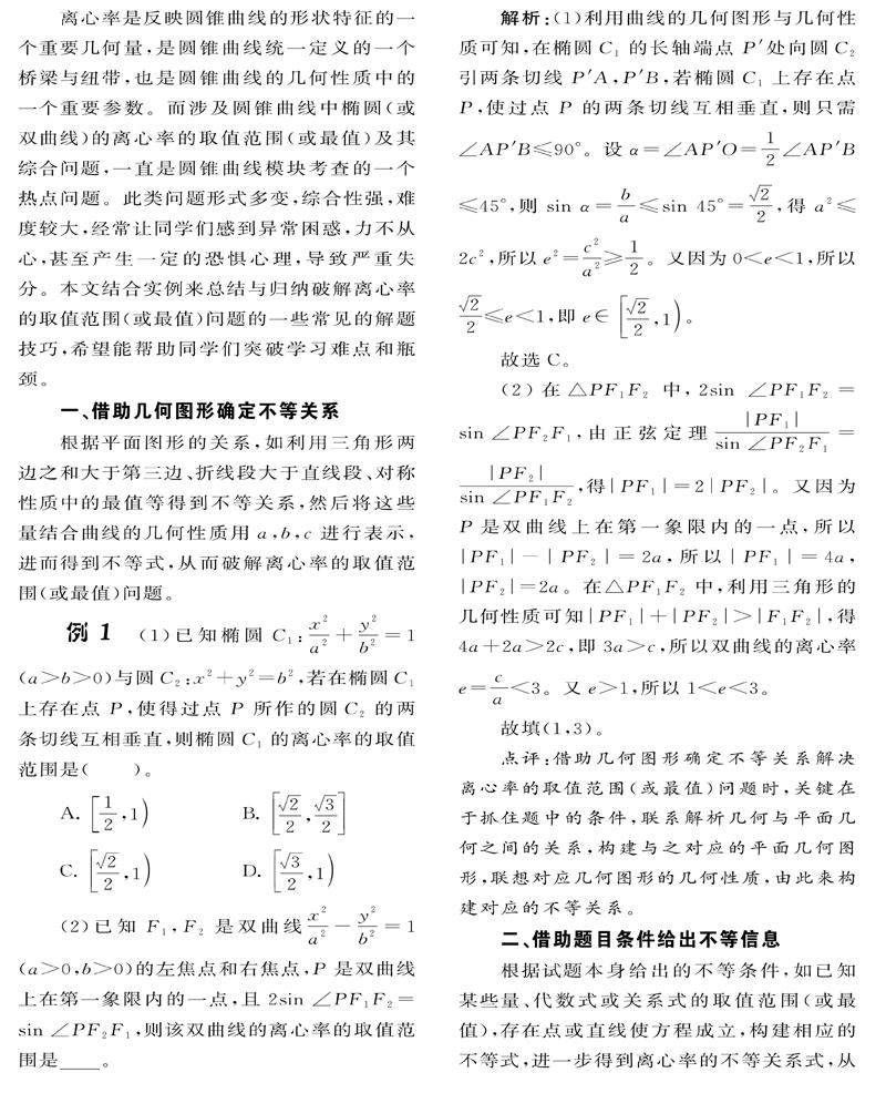 离心率是反映圆锥曲线的形状特征的一个重要几何量,是圆锥曲线统一定义的一个桥梁与纽带,也是圆锥曲线的几何性质中的一个重要参数。而涉及圆锥曲线中椭圆(或双曲线)的离心率的取值范围(或最值)及其综合问题,一直是圆锥曲线模块考查的一个热点问题。此类问题形式多变,综合性强,难度较大,经常让同学们感到异常困惑,力不从心,甚至产生一定的恐惧心理,导致严重失分。(剩余58字)