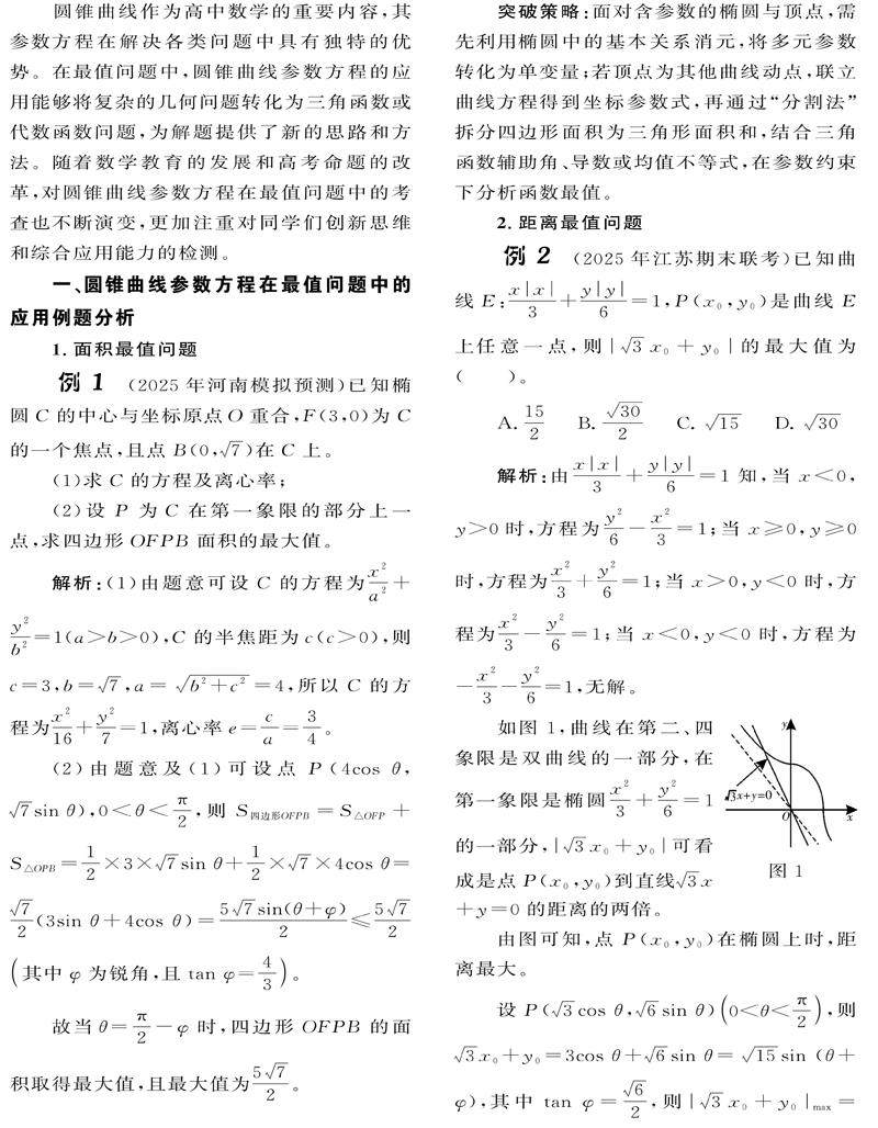 圆锥曲线作为高中数学的重要内容,其参数方程在解决各类问题中具有独特的优势。在最值问题中,圆锥曲线参数方程的应用能够将复杂的几何问题转化为三角函数或代数函数问题,为解题提供了新的思路和方法。随着数学教育的发展和高考命题的改革,对圆锥曲线参数方程在最值问题中的考查也不断演变,更加注重对同学们创新思维和综合应用能力的检测。(剩余0字)