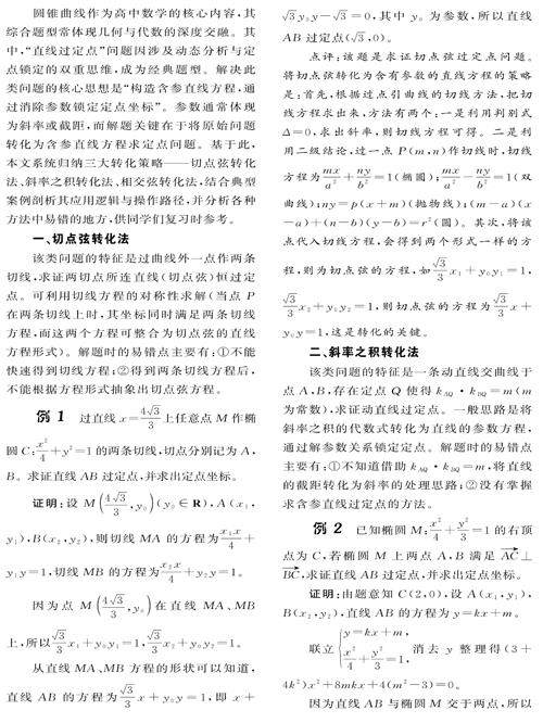 圆锥曲线作为高中数学的核心内容,其综合题型常体现几何与代数的深度交融。其中,“直线过定点”问题因涉及动态分析与定点锁定的双重思维,成为经典题型。解决此类问题的核心思想是“构造含参直线方程,通过消除参数锁定定点坐标”。参数通常体现为斜率或截距,而解题关键在于将原始问题转化为含参直线方程求定点问题。基于此,本文系统归纳三大转化策略——切点弦转化法、斜率之积转化法、相交弦转化法,结合典型案例剖析其应用逻辑与操作路径,并分析各种方法中易错的地方,供同学们复习时参考。(剩余0字)