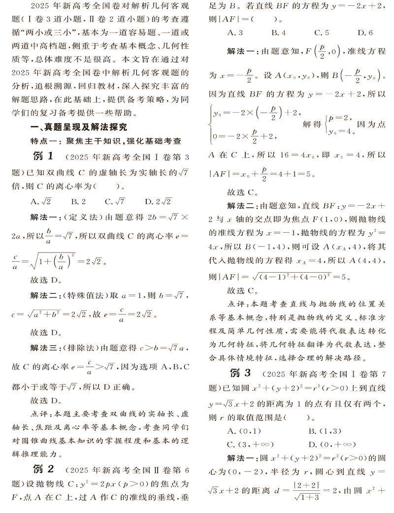 2025年新高考全国卷对解析几何客观题(I卷3道小题,Ⅱ卷2道小题)的考查遵循“两小或三小”,基本为一道容易题、一道或两道中高档题,侧重于考查基本概念、几何性质等,总体难度不是很高。本文旨在通过对2025年新高考全国卷中解析几何客观题的分析,追根溯源,回归教材,深入探究丰富的解题思路,在此基础上,提供备考策略,为同学们的复习备考提供一些帮助。(剩余0字)