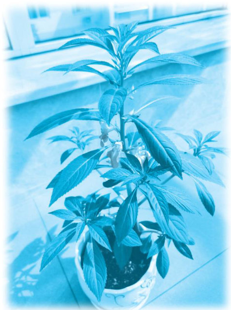 今天,我像往常一样去楼顶的阳 台照看自己种植的那些花,却发现角 落里的那株凤仙花竟然开花了!