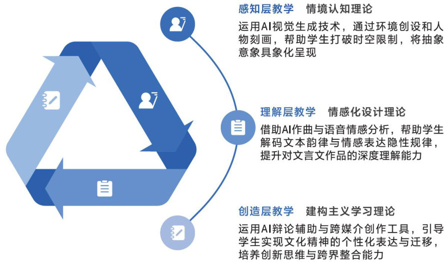 文言文教学具有双重抽象特点:一是语言具有抽象性;二是文言文背后蕴含的古代文化以及古人精神特质具有抽象性。学生在学习文言文时也常常遇到“古今割裂”“知行不一”等问题。为了让学生更好地理解文言文内容,解决教学重难点,真正进行有效的深度思维训练、深度情感熏陶及深度趣味阅读体验[1,我们将感知、理解、创造三者结合起来,积极探寻利用现代信息技术激活经典文本、开拓文化精神创造性转化的路径,充分借助人工智能(AI)将文言文较难体现的抽象意象转变为可感知的形象,逐步引导学生将其中的文化精神融人自己的认知过程,构建了AI赋能文言文教学的三阶模型(如图1)。(剩余5048字)