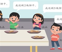 王老师给4名学生分了同样多的饼干。学生们吃了一些还剩一些。你知道谁吃的饼干最少,谁吃的饼干最多吗?方法一 假设王老师分给每名学生10块饼干,这样,很容易算出晶晶吃了 10-3=7 (块)饼干,小浩吃了 10-2=8 (块)饼干,涵涵吃了 1...