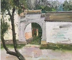 作品介绍:这是一幅充满写意气息的风景油画,描绘了江南徽派风格的民居院落一角;以柔和的灰白为主色调,搭配绿树的鲜嫩绿意与门内隐约的暖橙色墙面,营造出温润、静谧的氛围,贴合南方阴湿天气下的视觉感受。细腻而松弛的笔触,既保留了白墙灰瓦的质感,又通...
