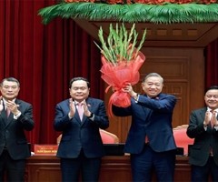 在全场掌声中,苏林高高捧起一束剑兰。陈青敏、陈锦绣、黎明兴站在苏林身旁,共同祝贺他当选为越共中央总书记。 2026年1月23日上午,越南共产党第十四次全国代表大会刚刚选出的新一届中央委员会,在越共中央总部召开第一次全会,选举未来五年的越共中...
