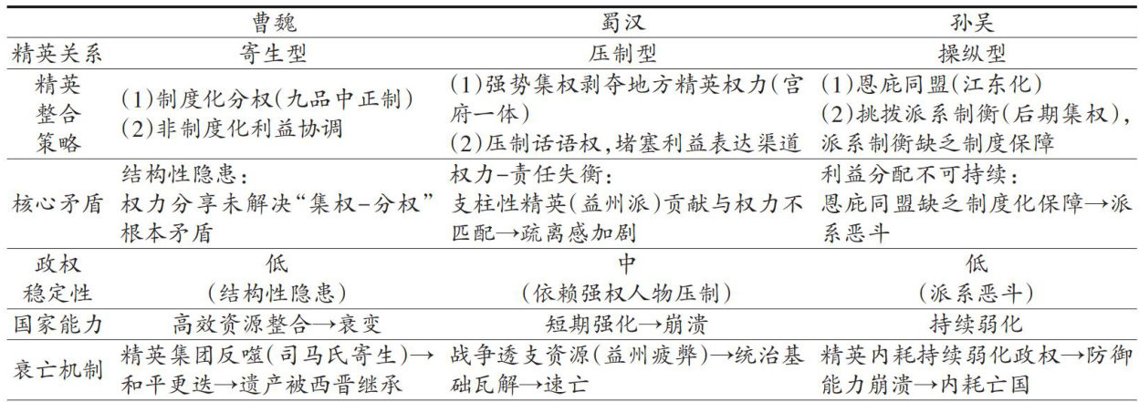 内容提要在汉末三国乱世中,魏、蜀、吴三国频兴兵事却未能结束分裂,而源出曹魏的西晋最终实现统一。为探究三国归晋的核心机制,从历史政治学视角出发,聚焦“精英关系"这一核心变量,融合“战争制造国家"理论与历史制度主义路径,运用比较案例分析方法,阐释魏、蜀、吴三国在战争压力下的国家建构逻辑。三国政权精英整合策略的差异塑造了三种精英关系模式:曹魏(西晋)的“寄生型"精英关系依托制度化分权实现资源高效积累,但是政权内部精英集团形成制度性反噬能力,权力核心出现非制度性转移,导致政权更迭;蜀汉“压制型"精英关系因过度集权压制本土精英,致使统治基础瓦解;孙吴“操纵型"精英关系依赖派系制衡,引发持续的精英内耗。(剩余9899字)