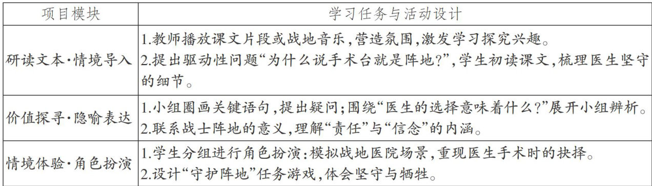 《义务教育语文课程标准(2022年版)》强调,要“增强课程实施的情境性和实践性,促进学习方式变革”。三年级语文上册《手术台就是阵地》是一篇革命文化题材的课文,通过战地医生坚守岗位的故事,展现了责任与信念的力量。然而,低年级学生对战争背景和隐喻表达缺乏感性经验,传统的讲授式教学容易使其停留在表层理解,难以引发深刻的情感共鸣。(剩余3986字)