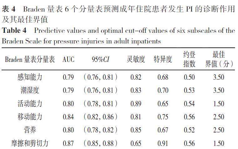 【摘要】 背景 Braden量表是全球公认的有良好信效度的压力性损伤危险预测工具,但因应用人群不同,其最佳预测界值也存有争议。该量表在我国临床应用的预测界值为≤16分,欧美国家多以≤18分为界值,但其在我国住院患者中的预测作用的研究较少。目的 横断面调研全国13个省/自治区、46所三级医院成年住院患者压力性损伤的流行病学特征,分析Braden量表及其6个分量表预测压力性损伤发生的效能及其最佳界值。(剩余23623字)