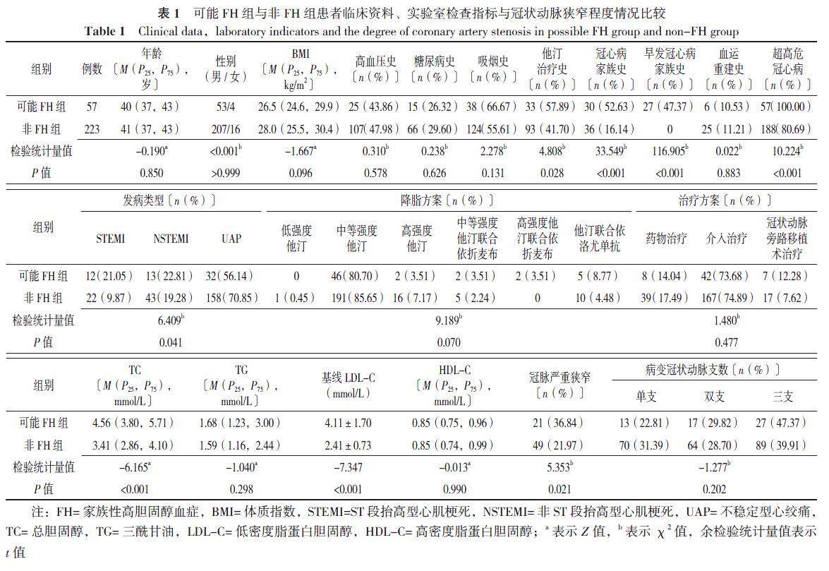 ≤45岁急性冠脉综合征患者可能家族性高胆固醇血症的临床特点及血脂达标影响因素研究