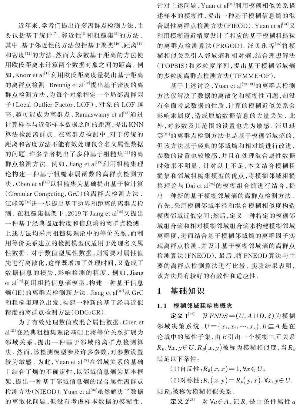 摘要:离群点检测(又称异常点检测)是数据挖掘领域中一个重要的研究方向,其目的是找出显著区别于其他数据的数据点. 针对基于传统粗糙集理论的离群点检测方法存在忽略样本的模糊性和邻域关系等问题,利用模糊邻域粗糙集弥补经典粗糙集的不足,并结合熵的不确定性,提出一种新的基于模糊邻域熵的离群点检测方法. 首先,(剩余369字)