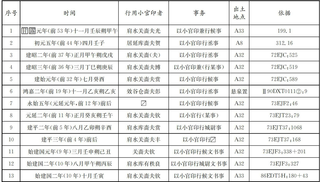 汉代律令与文书简牍中可见一类名为“小官印"的印章。前贤时彦多依据东汉官制文献中“孝武皇帝元狩四年,令通官印方寸大,小官印五分"①及“下至二百石,皆为通官印""二百石以上,皆为通官印"等记载②,将小官印的使用者定为二百石之下小官吏,亦即少吏③;同时认为小官印就是玺印、封泥实物中形制为半印者,也是传世文献中的“半通"印或“半通之铜”④。(剩余16608字)