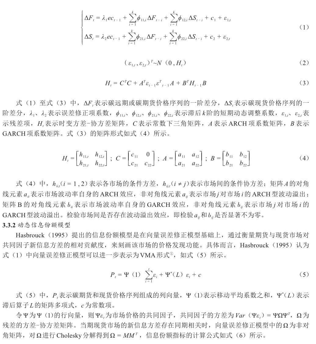 摘要:碳期货市场的建设对于提升我国碳市场的运行效率和促进各行业低碳转型以及林业碳汇、可再生能源等低碳领域的发展具有重要意义。文章基于2017年1月至2023年4月上海碳远期市场与现货市场、欧盟碳期货市场与现货市场的日度价格数据,采用VEC-BEKK-GARCH模型对上海碳远期市场与现货市场、欧盟碳期货市场与现货市场之间的信息溢出效应进行比较分析,进一步扩展信息份额模型及套期保值分析方法,动态测度上海碳远期市场与欧盟碳期货市场的价格发现与套期保值功能。(剩余26215字)