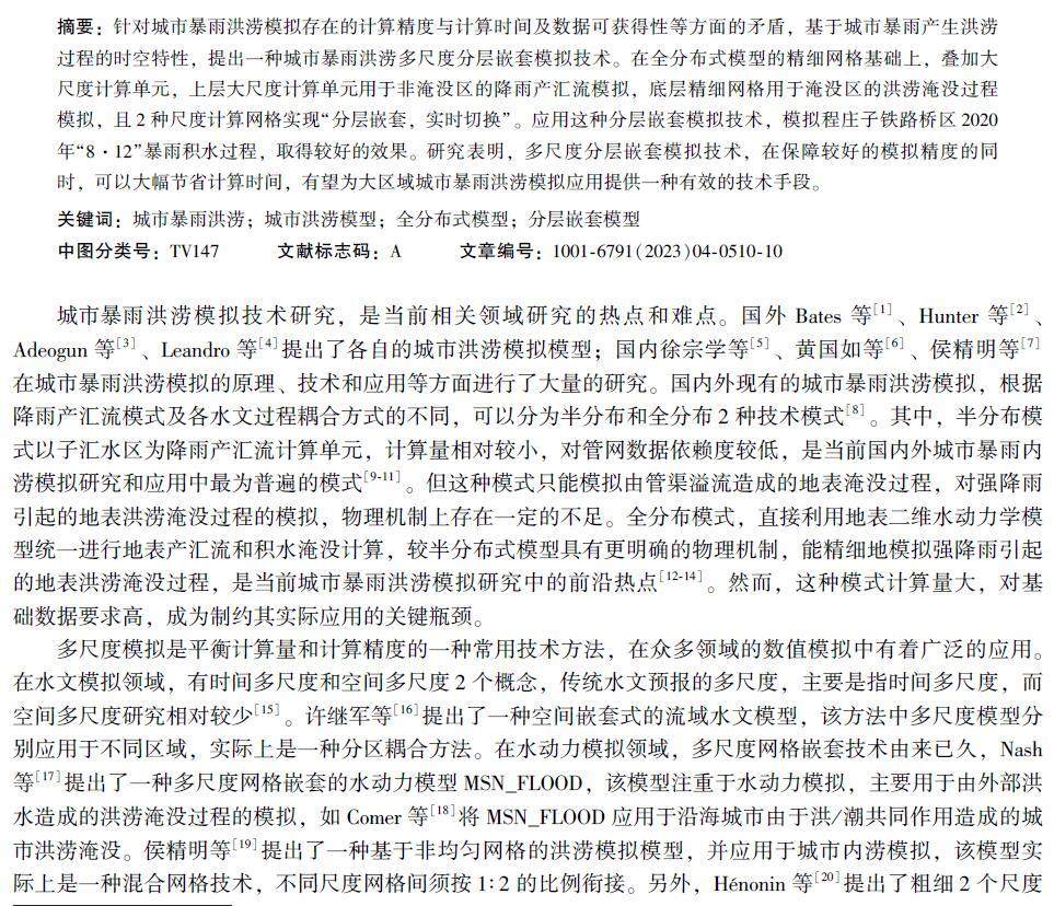 摘要:针对城市暴雨洪涝模拟存在的计算精度与计算时间及数据可获得性等方面的矛盾,基于城市暴雨产生洪涝过程的时空特性,提出一种城市暴雨洪涝多尺度分层嵌套模拟技术。在全分布式模型的精细网格基础上,叠加大尺度计算单元,上层大尺度计算单元用于非淹没区的降雨产汇流模拟,底层精细网格用于淹没区的洪涝淹没过程模拟,且2种尺度计算网格实现“分层嵌套,实时切换”。(剩余14585字)