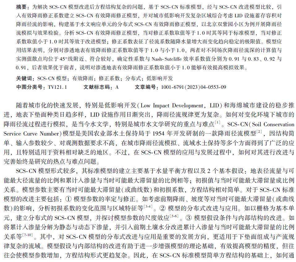 摘要:为解决SCS-CN模型改进后方程结构复杂的问题,基于SCS-CN标准模型,经与SCS-CN改进模型比较,引入有效降雨修正系数建立SCS-CN有效降雨修正模型,并对城市低影响开发复杂区域综合考虑LID设施蓄存容积对降雨径流的影响,构建基于水文响应单元的分布式SCS-CN有效降雨修正模型,以北京双紫园小区为例开展降雨径流模拟与效果检验。(剩余14459字)