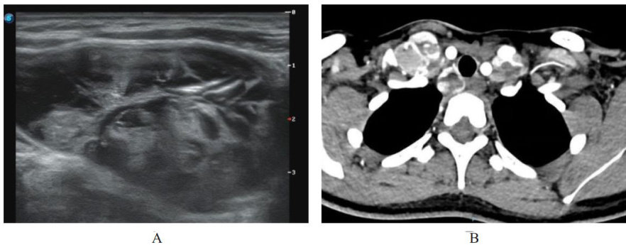 ABSTRACTFollcular variant papillary thyroid carcinoma (FVPTC) is commonly found in young middle-aged women, cases in children adolescents are relatively rare.The main driving genes FVPTC are the RAS oncogene family or B-Raf proto-oncogene serine/threonine protein kinase (BRAF) , DICERl gene mutation is rarely reported in this subtype.This article reports a case recurrentFVPTC with positive DICER1 mutation in an adolescent,aiming to provide reference for the clinical diagnosis treatment FVPTC.The patient,a 19-year-old female,underwent total thyroidectomy central lymph node dissection due to thyroid nodules 5 years ago, was pathologically diagnosed with follcular tumor uncertain malignant potential (FT-UMP);after surgery,the patients did not regularly undergo thyroid-stimulating hormone (TSH) suppression therapy follow-up as instructed. Two months ago,the patient visited the hospitaldue to enlarged cervical lymph nodes,imaging suggested tumorrecurrence with metastases to both lungs vertebrae, multigene testing indicated a DICER1 gene mutation. After comprehensive multidisciplinary consultation,bilateral cervical lymph node dissection was performed, postoperative pathology confirmed the diagnosis metastatic FVPTC. Te clinicans should focus on rare gene mutations such as DICER1 in the FVPTC patients, for adolescent patients,follow-up formulation individualized treatment plans should be emphasized to achieve early tumor identification precise intervention, improve the long-term prognosis patients.