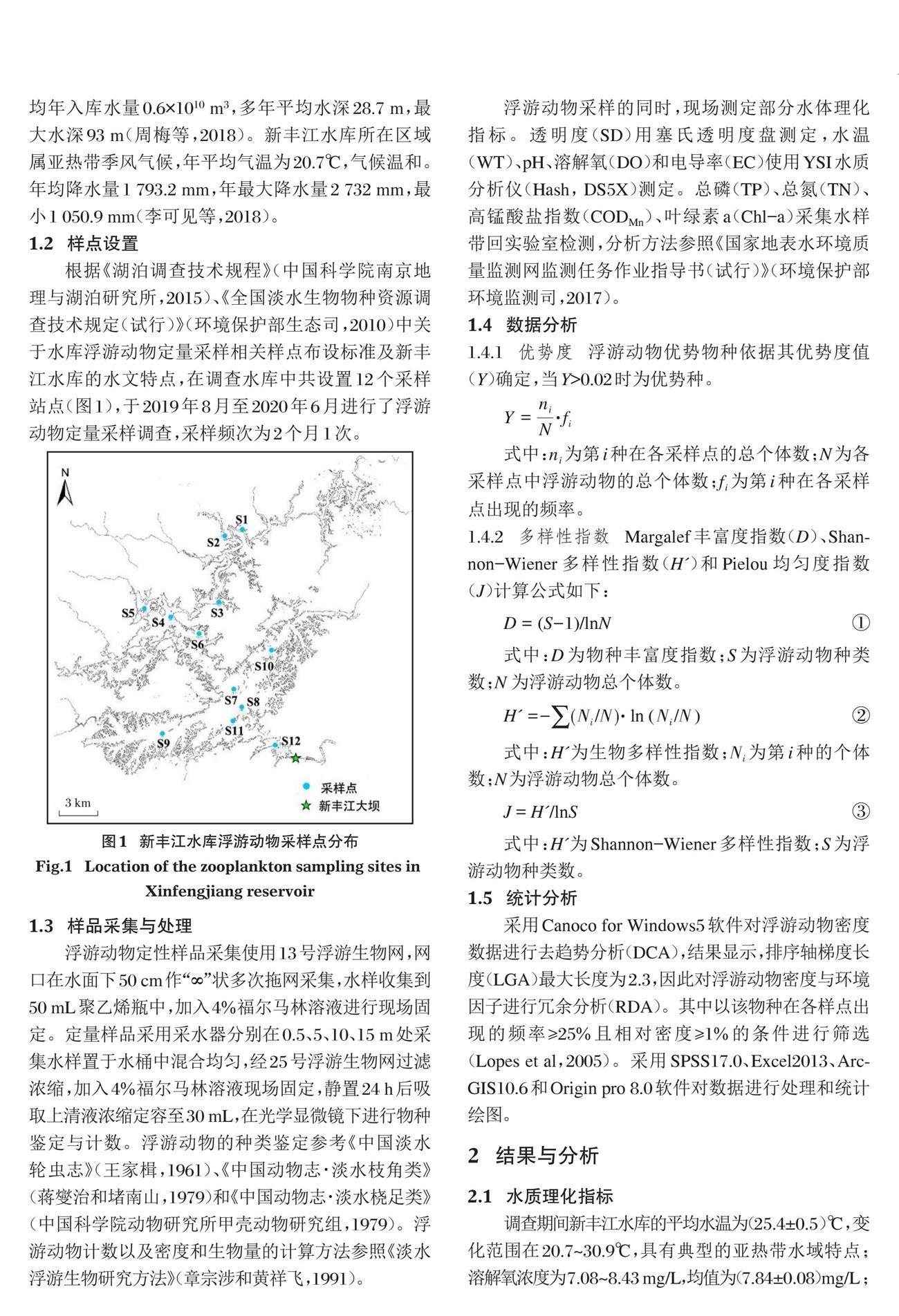 摘要:分析华南大型饮用水源水库浮游动物群落结构特征及主要环境影响因子,为水库生态环境保护提供基础资料和参考依据。于2019年8月至2020年6月在新丰江水库设置 12个采样站点进行每2个月1次的浮游动物监测,设置采样站点12个。结果显示,调查期间共采集到浮游动物19属30种,其中轮虫8属17种,枝角类5属7种,桡足类6属6种,夏季出现的种类数最多(25种),春季最少(14种);各站点浮游动物密度和生物量月均值分别为11.52~161.52 个/L和0.92~17.65 mg/L,具有极显著的季节差异(P<0.01),表现为夏季高、冬季低的特点;空间分布上呈现为上游和下游河道型库区高,中心敞水区低的分布趋势;浮游动物Shannon-Wiener多样性指数为0.87~1.19,Margalef丰富度指数为0.97~1.53,Pielou均匀度指数为0.54~0.93。(剩余17115字)