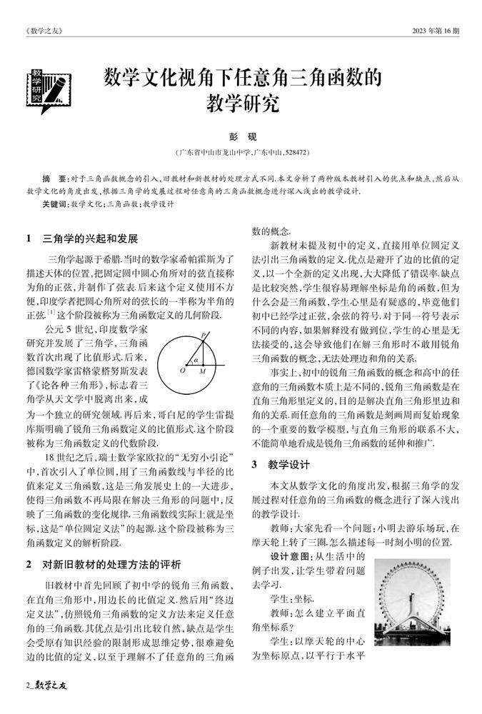 摘要:对于三角函数概念的引入,旧教材和新教材的处理方式不同.本文分析了两种版本教材引入的优点和缺点,然后从数学文化的角度出发,根据三角学的发展过程对任意角的三角函数概念进行深入浅出的教学设计.