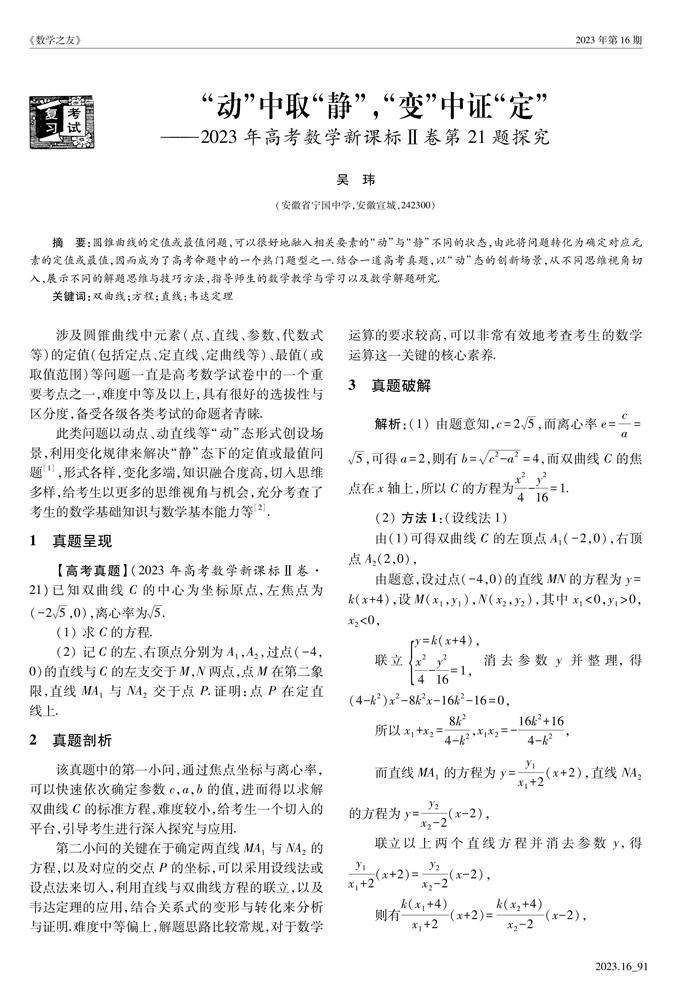 摘要:圆锥曲线的定值或最值问题,可以很好地融入相关要素的“动”与“静”不同的状态,由此将问题转化为确定对应元素的定值或最值,因而成为了高考命题中的一个热门题型之一.结合一道高考真题,以“动”态的创新场景,从不同思维视角切入,展示不同的解题思维与技巧方法,指导师生的数学教学与学习以及数学解题研究.