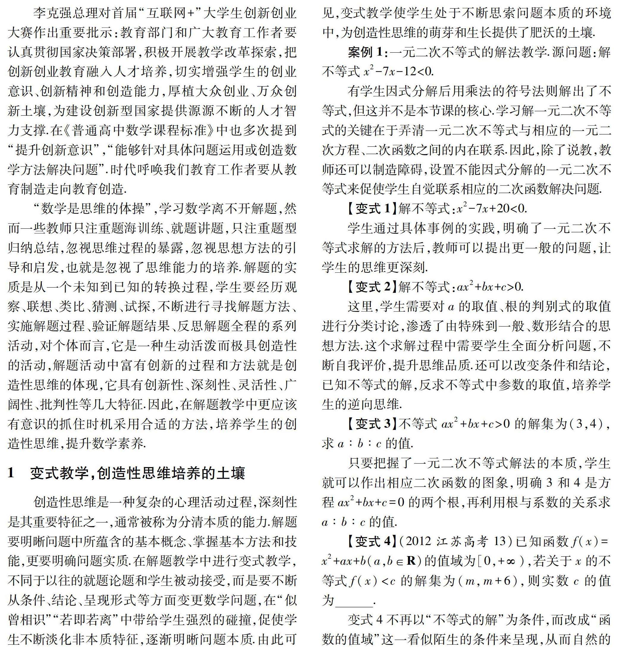 摘 要:数学解题过程是落实学生创造性思维培养的重要环节.本文阐述了变式教学,一题多解,总结反思在创造性思维培养的重要作用,同时在课堂教学中实践探索,以提高学生的高阶思维.