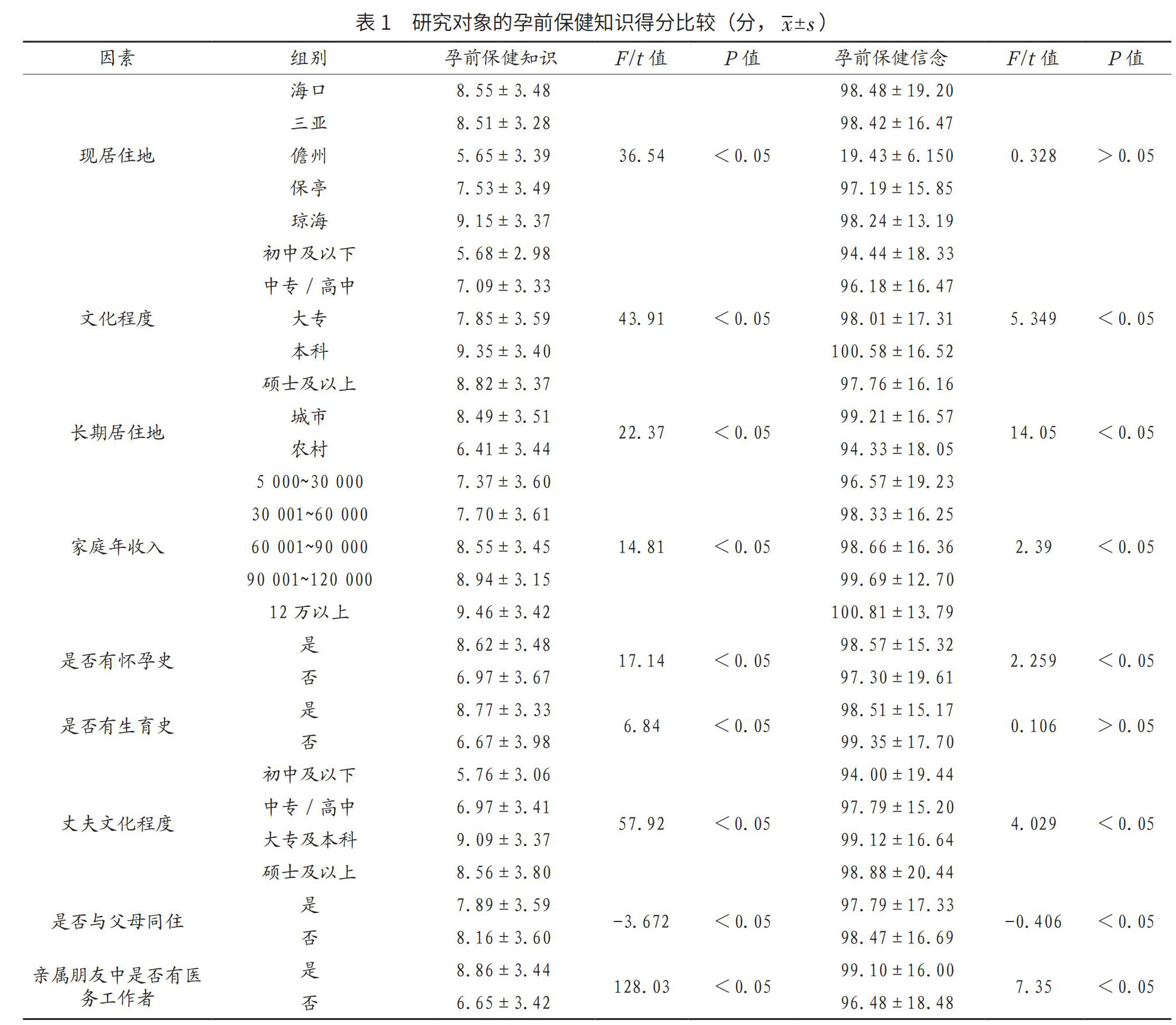 【摘要】目的 调查海南省育龄妇女孕前保健知识与健康信念状况,分析其影响因素,为开展孕前保健工作提供依据。方法 根据分娩量的比例,选取2021年3月至11月海南省东部的琼海市、西部的儋州市、南部的三亚市、北部的海口市、中部的保亭县共计1 299名育龄妇女为研究对象,比较不同类别育龄人群孕前保健知识及健康信念现状,并采用多重线性回归分析影响孕前保健知识及健康信念的相关因素。(剩余3591字)