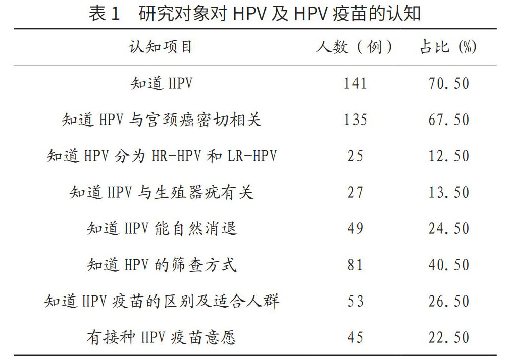 【摘要】目的 分析女性对HPV和HPV疫苗的认知情况,为宫颈癌防治提供参考。方法 选取2019年12月至2020年5月在深圳市龙华区人民医院参与宫颈癌筛查的200例女性作为研究对象进行回顾性分析,均对其行问卷调查,以匿名自填的方式完成问卷,分析其对HPV和HPV疫苗的认知情况。结果 200例研究对象对HPV及HPV疫苗的认知程度较低,有HPV疫苗接种意愿的人数占比较低;媒体、家人及朋友介绍、健康教育课程是其了解HPV相关知识的主要途径;认为性生活过早、性伴侣过多、妊娠次数过多、有吸烟饮酒等不良习惯、长期服用避孕药是引发HPV的因素;多因素Logistic回归分析发现,年龄、文化程度均是影响女性对HPV疫苗认知情况的独立危险因素(P