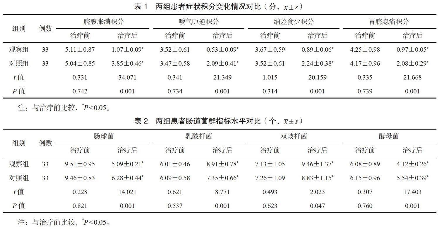 【摘要】目的 研究在功能性消化不良患者的临床治疗中应用调胃健脾汤加减辨证治疗的疗效。方法 选取2020年6月至2021年9月阳信县河流镇卫生院收治的功能性消化不良患者66例,按随机数字表法分为对照组和观察组,各33例。给予对照组患者常规西药治疗,观察组患者在以上基础之上加用调胃健脾汤加减辨证治疗。对组间症状积分、肠道菌群、胃肠激素及动力指标水平变化情况展开比对,同时分析两组不良反应发生情况。(剩余4668字)