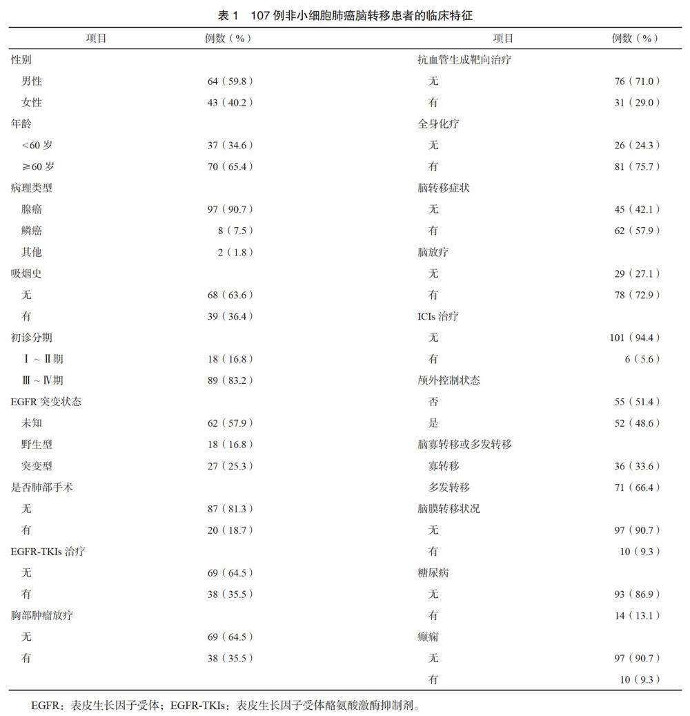 【摘要】目的 通过非小细胞肺癌脑转移患者单中心回顾性分析,探讨其总生存及预后因素。方法 收集2014年5月至2021年5月承德医学院第二附属医院诊治的107例非小细胞肺癌脑转移病例,运用Kaplan-Meier法进行生存分析,采用单因素、多因素分析筛选非小细胞肺癌脑转移的预后影响因素。结果 本研究107例患者的中位脑转移时间为8个月,脑转移治疗后中位无进展生存期(PFS)为