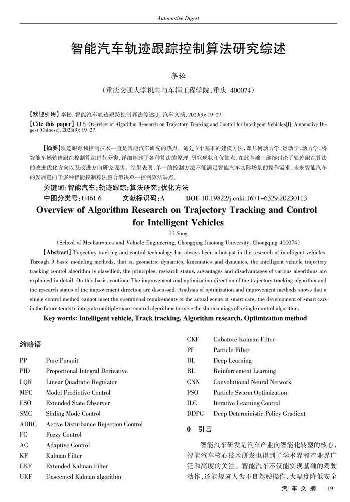 【Cite this paper】 LI S. Overview of Algorithm Research on Trajectory Tracking and Control for Intelligent Vehicles[J]. Automotive Digest (Chinese), 2023(9): 19-27.