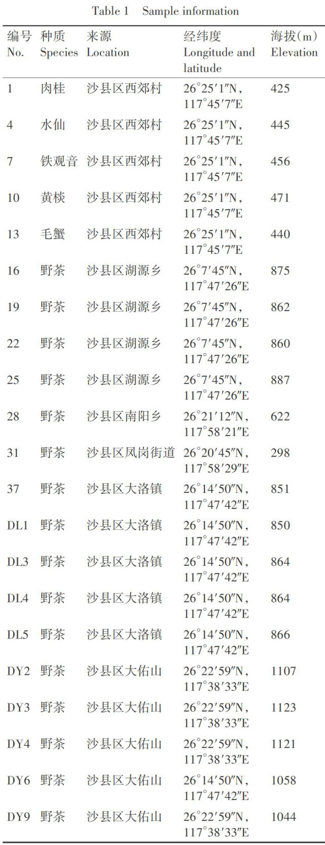 Abstract:【Objective】 Shaxian County has abundant resourcesof wildtea plant Camelia sinensis,and conducting phylogeneticanalysisoftearesourcesinthearea hasgreat significance for itsresearch,protection,andutilization. 【Method】Basedon ISSR molecular marker technology,the genetic relationship of 16 wild teaand 5 cultivated resources in Shaxian Countywasanalyzed.NTSYSsoftware wereused for genetic similarityclusteringanalysisand principal coordinate analysis.Result】A totalof9ISSR primers were screened,and88amplifiedbands were detected,including74 polymorphic sites,withapolymorphismrateof84.O9%.Clusteranalysisand principal coordinateanalysis revealed that whenthegeneticcorrelationcoeficientreachesO.68,21tearesourcescanbedivided intothree categories.Rougui'has thefarthest genetic distance fromother species,wild tearesources such as HuyuanandNanyang haveaclose genetic distance from‘Shuixian','Huangdan','Maoxie',and 'Tieguanyin',whileresources inDaluo Townand Dayoushan havea far genetic distance from the reference cultivated species.【Conclusion】 Shaxian County hasabundant wild tea resources, complex genetic diversity,and strong potential for exploring excellent germplasm.