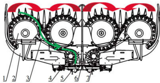 割台作为大型青贮机核心部件之一,其制造质量直接决定青贮机切割性能及切割效率;目前市场青贮机割台主要形式分为圆盘式和链刀式,且随着青贮饲料收获机市场结构的变化,圆盘式割台青贮机也占据了主流;圆盘割台主要结构如图1,其中集茎滚筒两两顺逆搭配组合,与清料器、塔轮配合工作组成物料运输通道,如图1标识方向。(剩余4882字)