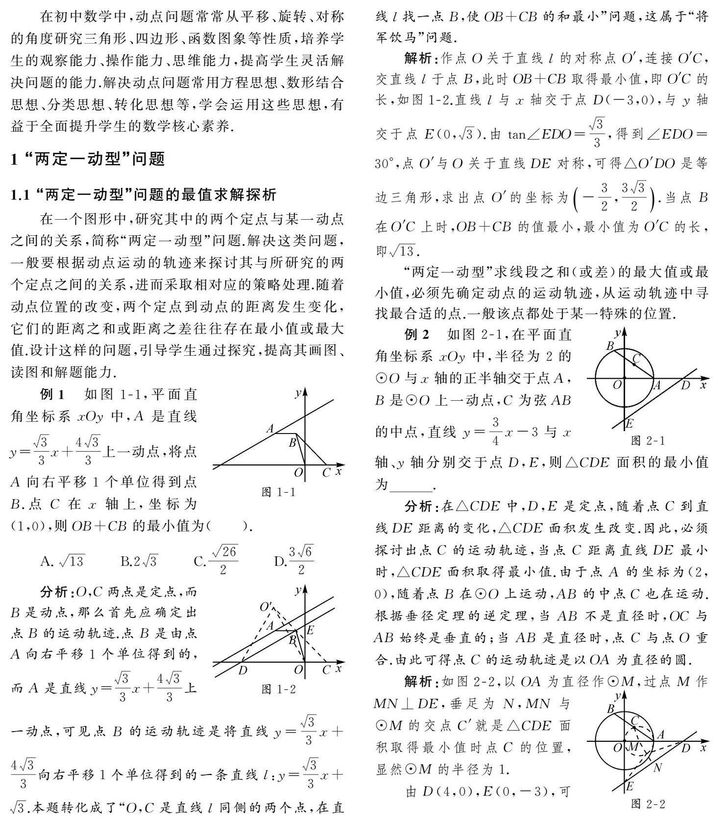 在初中数学中,动点问题常常从平移、旋转、对称的角度研究三角形、四边形、函数图象等性质,培养学生的观察能力、操作能力、思维能力,提高学生灵活解决问题的能力.解决动点问题常用方程思想、数形结合思想、分类思想、转化思想等,学会运用这些思想,有益于全面提升学生的数学核心素养.