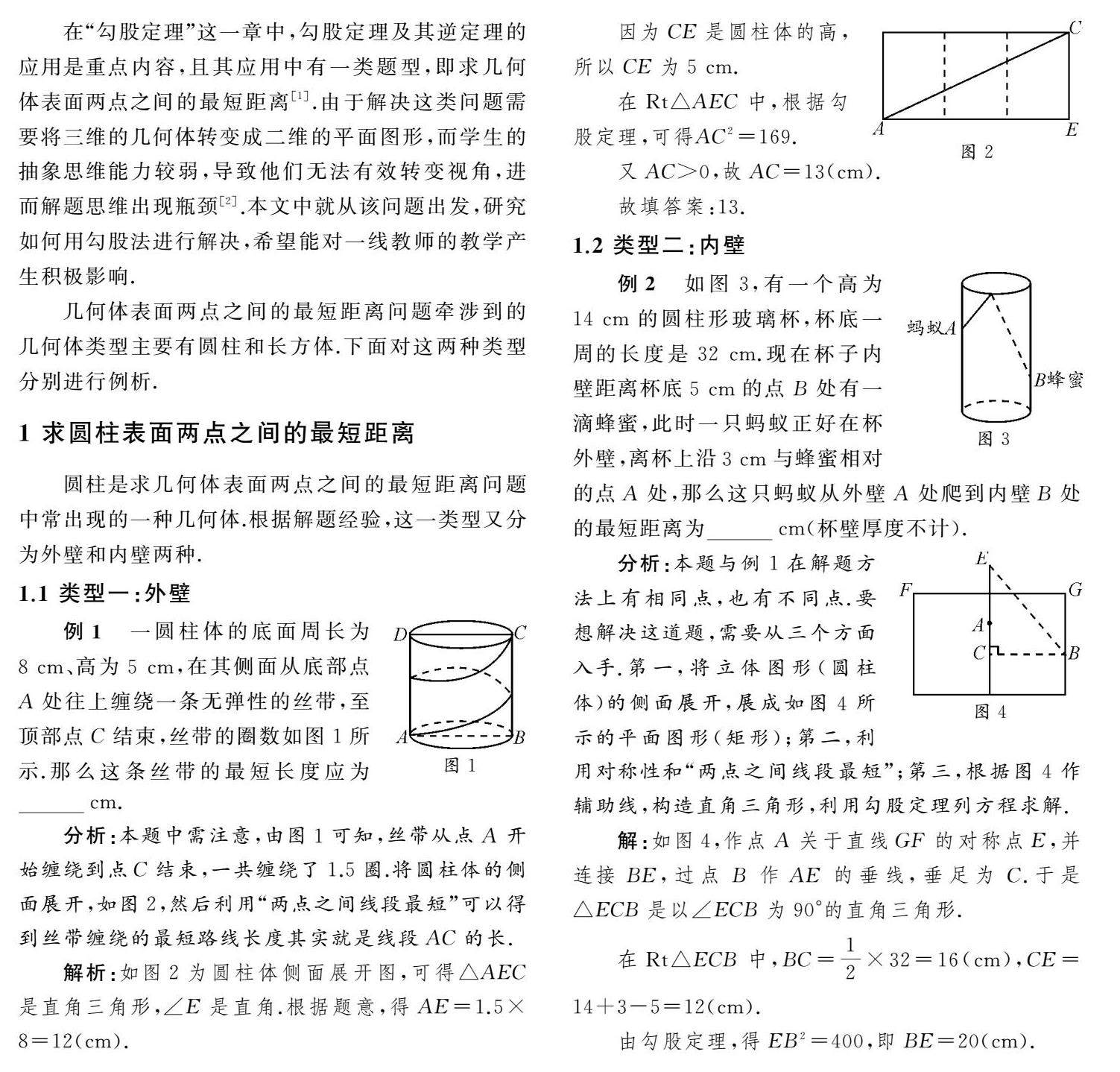 摘要:勾股定理是人教版八年级下册第十七章的内容,勾股法是日后解决诸多实际问题的重要方法.教材中勾股定理的应用主要体现在求几何体表面两点之间最短距离、求旗杆高度、求断裂树枝高度、池塘芦苇问题等方面,每种问题类型都非常经典.本文中主要研究了如何转变视角突破求几何体表面两点之间最短距离的思维瓶颈.