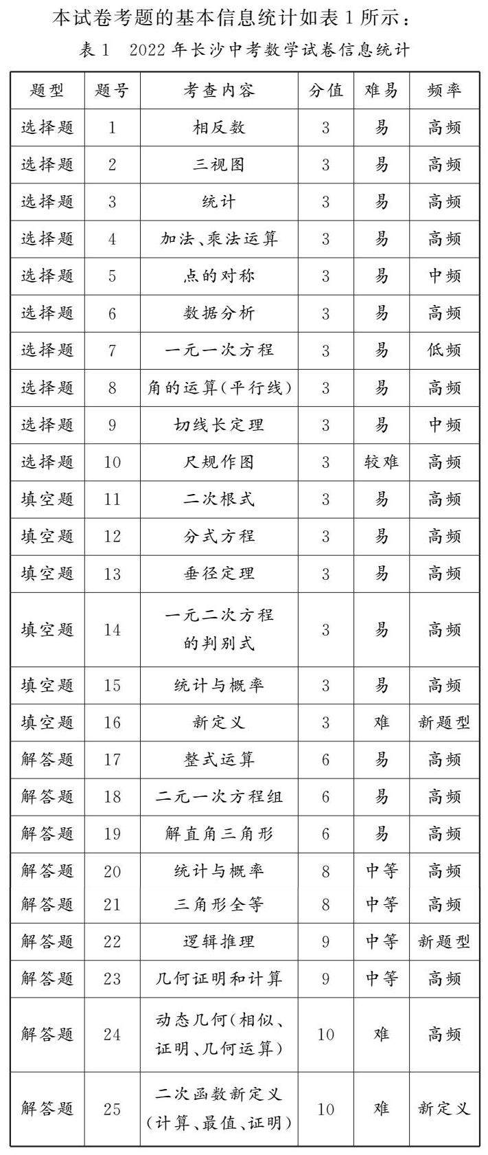 2022年长沙市中考数学试卷和往年相比,相对平稳,延续了长沙考区往年的一贯风格,既考查全面又重点突出,既提问灵活又题干严谨,既内容丰富又结构合理.该试卷最鲜明的特点是数学情境化、数学德育化、数学时政化,试卷起点较低却又不失高度,起到了很好的选拔作用.