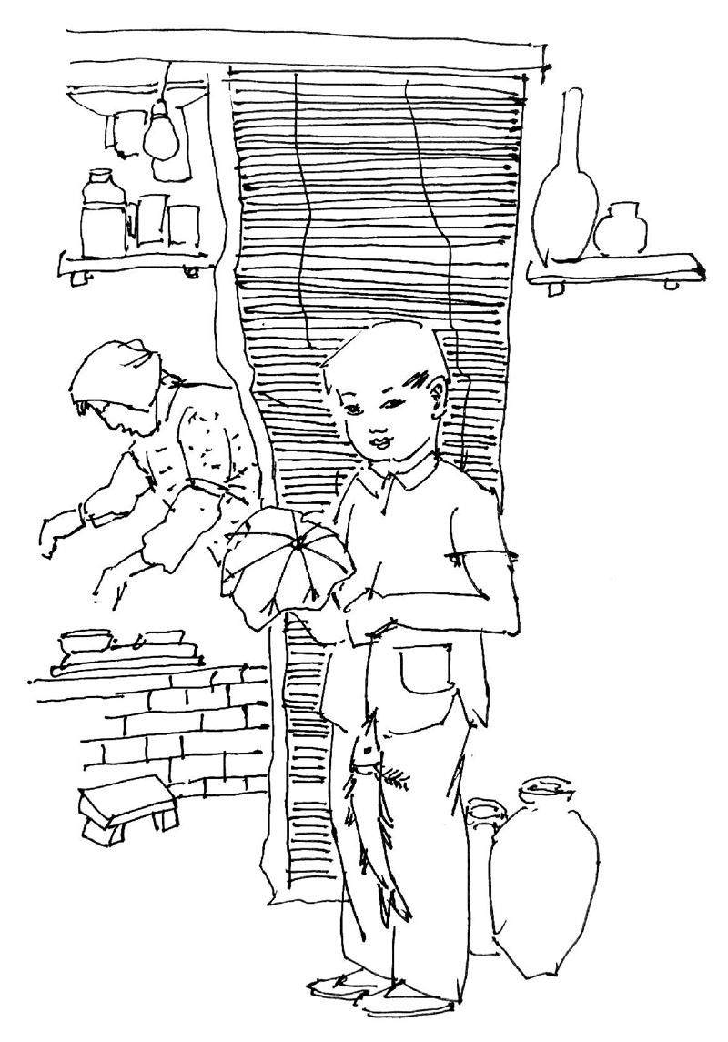 我站在门口,一手捏着一张盘子大的小荷叶,一手提着用狗尾巴草串着的一条小鱼。小鱼足有一拃长,银亮的身子直挺挺的,像一把刚磨亮的小刀。