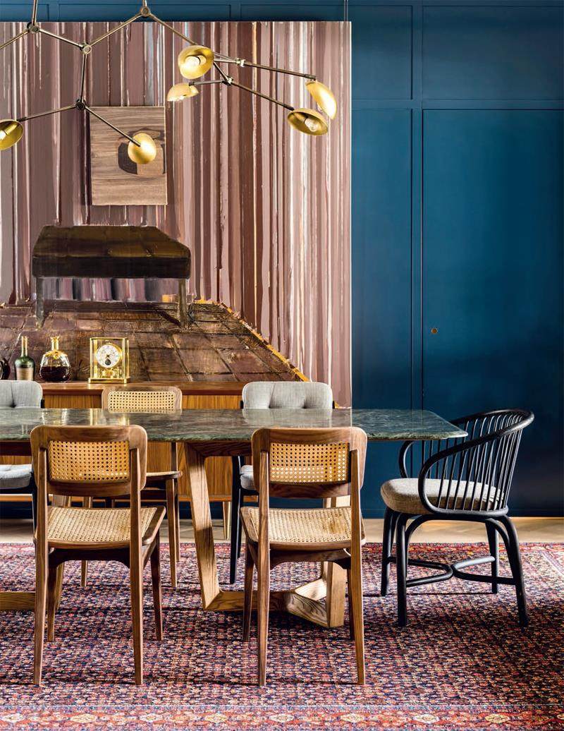 1.滑动的金属和玻璃隔板将餐厅和客厅隔开。客厅采用天然色调,主要是木材和藤条与餐厅醒目的蓝色形成强烈但互补的对比。