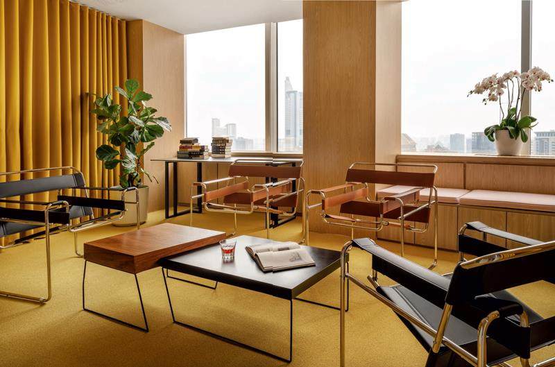 明黄色整体基调给人感官上的极大舒适,灵感在此也更容易迸发,更像是一间装潢别致的度假酒店。随处一抬头,都可以看到开阔窗景外的国贸CBD,在高远处享受一片不同的商务中心景观。包豪斯最经典的代表Wassily椅,以金属为线条框架,光亮、冰冷的色泽与温暖的办公空间基调形成一种奇妙的对照。