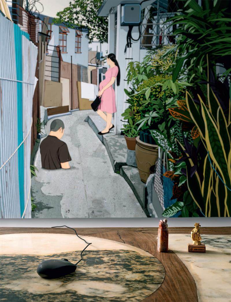 刘钢的办公室中有一件青年艺术家陈飞的大尺幅作品《破日子》,它为这里增添了都市办公室的别样气氛。情景式画面与复古鼠标、印章形成有趣的呼应。