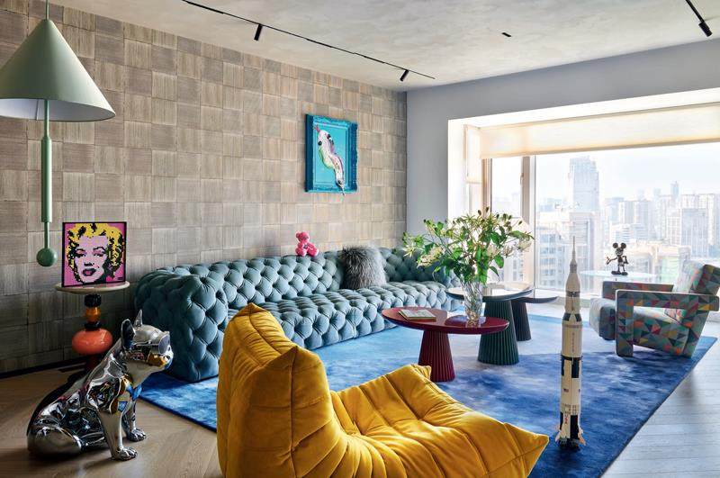 蓝灰色Chester Moon多人座沙发是Baxter的经典出品;薄荷绿色的吊灯以及三张茶几均来自Maison Dada;明黄色TOGO单人沙发由Ligne Roset写意空间出品;画面右侧的Utrecht扶手椅出自Gerrit Thomas Rietveld之手,由Cassina出品,该配色为特别版本;地毯是由FULI富立织锦与Marco Piva携手推出的《袤云》(Cielo)。(剩余2426字)