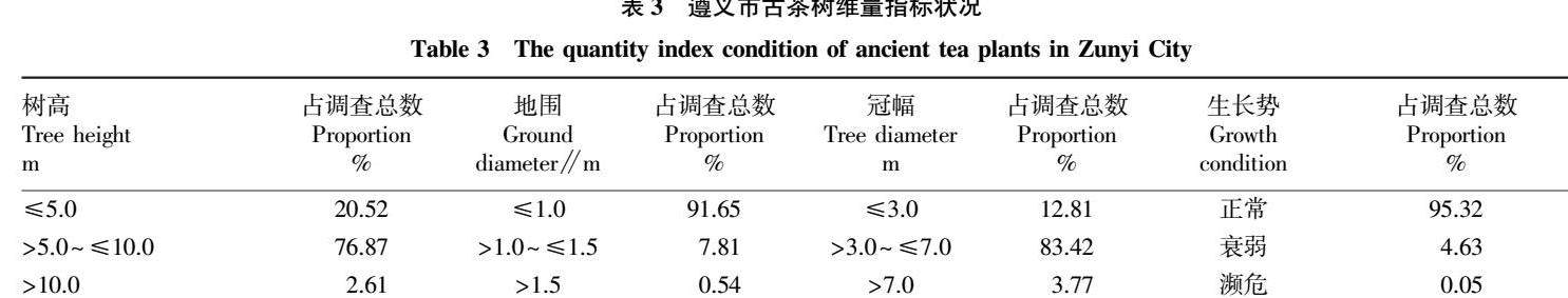 摘要 通过收集资料、现场走访等方式对遵义市古茶树开展调查,分析了古茶树的种类、数量、分布和生长情况。结果表明:遵义古茶树分布于习水县、凤冈县等10个县(市、区),资源储量为1 881株,其中单株古茶树1 844株,还有1个37株组成的古茶树群。共计3个种和变种,其中疏齿秃房茶(疏齿茶)Camellia gymnogyna var. remotiserrata数量最多,为1 613株。(剩余6493字)