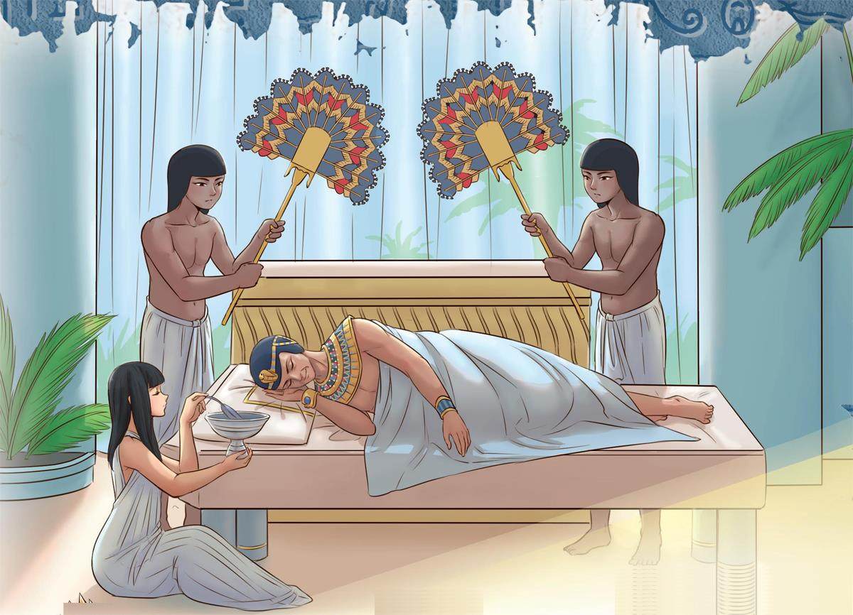 奢华的床榻旁,两位执扇人一左一右,各拿一把镀金木柄, 有鸵鸟羽毛装饰的扇子,正为法老扇风纳凉。