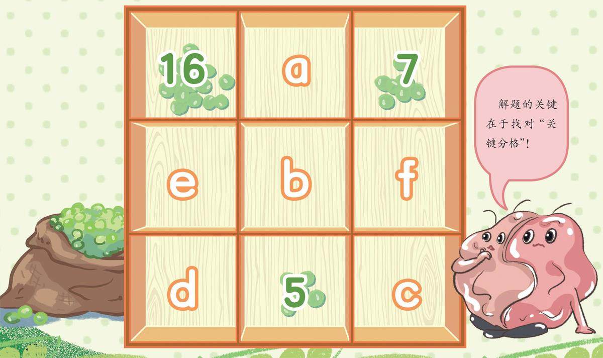 大家准备动手把豌豆种子装进九宫格果盘里,发现其中的三个分格已经提前摆好了。迷糊公主要求每行每列、每个对角线的格子里豌豆种子的总数相等,那么我们需要在剩下的格子里分别装入多少颗豌豆种子?