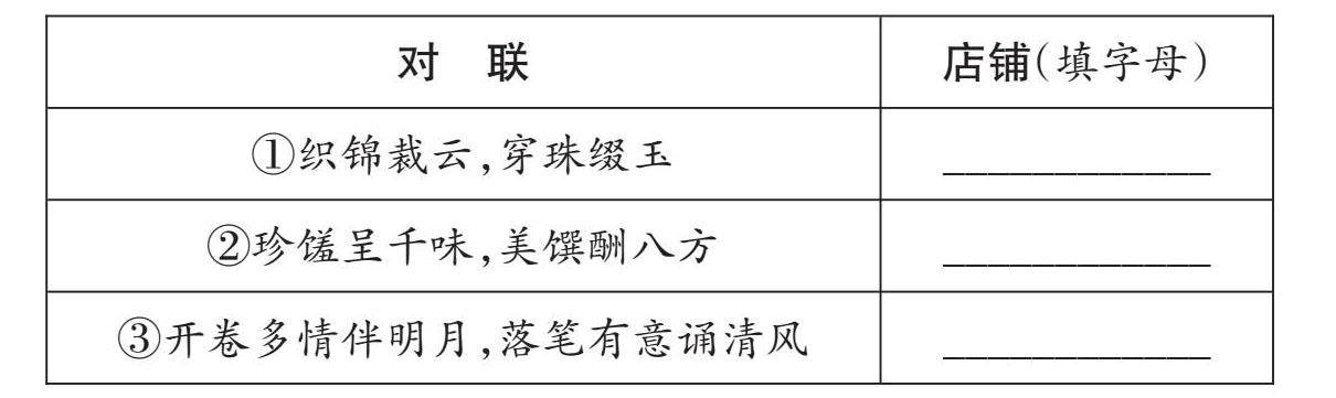 (1)同学们搜集了几个店铺门头的对联。请你将店铺序号填写在对应的横线上。