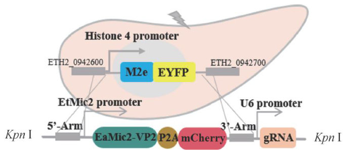 Abstract: Infectious bursal disease (IBD) severely restricts the economic development of the poultry industry. Therefore,the development of safe and efficient IBD vaccines has become a key topic of considerable interest. To explore the feasibility of using Eimeria tenell as a live vector for the expression and delivery of infectious bursal disease virus (IBDV) antigens,this study constructed a genetically modified strain of E . tenella(Et-VP2) expressing the VP2 protein of the IBDV.An expression plasmid was constructed,digested with enzymes,and then transfected into E .tenella using nuclear transfection. Flow cytometry was utilized to sort and select positive strains expressing the red fluorescent reporter gene (mCherry),and the expression of the VP2 gene was identified at both the genetic and protein levels. Results showed that after three passages in vivo in chicks,the transgenic E .tenela expressing VP2 protein had a positive rate of fluorescence exceeding 95% , confirming successful integration and stable expression of the foreign gene at both the genetic and protein levels (with fluorescence rates reaching 95% in the ofspring population). Indirect immunofluorescence results indicated that the fusion protein (Mic2-linker-VP2) was localized at the apical end of the sporozoites of E . tenella. This study successfully established a stable transfection system for E . tenella,laying the foundation for subsequent research on the immune protection of genetically modified strains against infectious bursal disease.