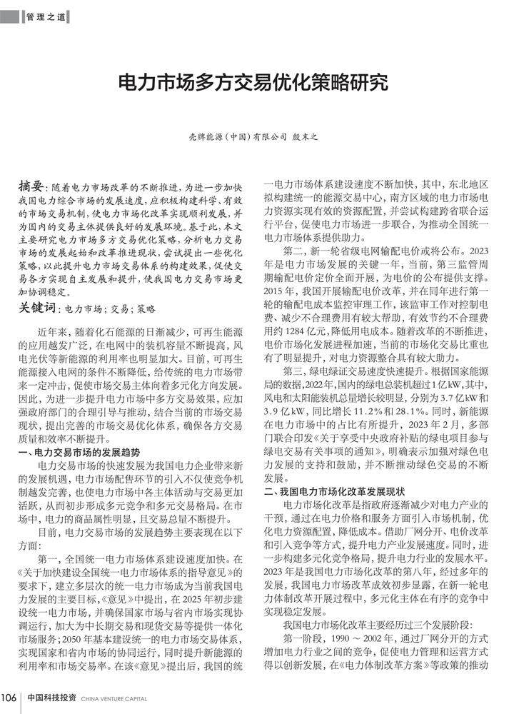 摘要:随着电力市场改革的不断推进,为进一步加快我国电力综合市场的发展速度,应积极构建科学、有效的市场交易机制,使电力市场化改革实现顺利发展,并为国内的交易主体提供良好的发展环境。基于此,本文主要研究电力市场多方交易优化策略,分析电力交易市场的发展起始和改革推进现状,尝试提出一些优化策略,以此提升电力市场交易体系的构建效果,促使交易各方实现自主发展和提升,使我国电力交易市场更加协调稳定。(剩余5005字)