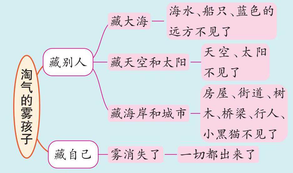 《雾在哪里》一课中,雾像一个淘气的孩子,和世界玩起了捉迷藏的游戏。让我们一起结合思维导图来梳理一下吧!