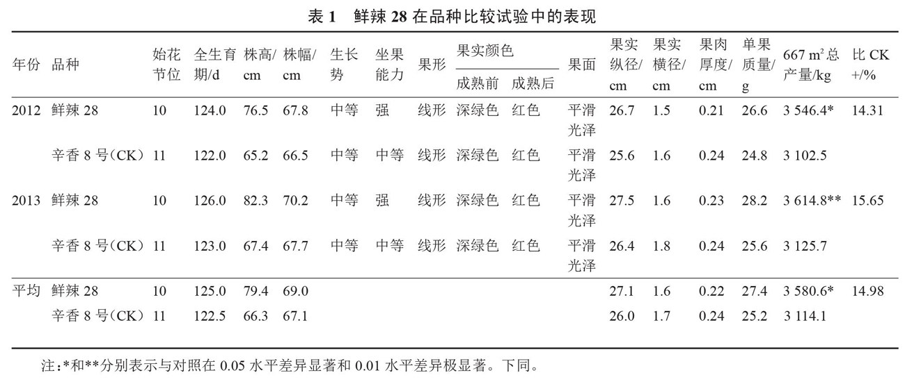 摘 要: 鲜辣28是以自交系P2011-2为母本、P2011-8为父本杂交育成的辣椒新品种。该品种在河南地区秋延大棚栽培模式下的生育期约为125 d,为中熟品种类型。植株生长势中等,连续坐果能力强;株高76~83 cm,株幅67~71 cm,始花节位10节;果实线形,果实成熟前深绿色,成熟后为红色,果面平滑亮泽,果实纵径26~28 cm,横径1.5~1.6 cm,果肉厚度0.21~0.23 cm;维生素C含量(w,后同)为92 mg·100 g-1,辣椒素总含量为54.2 mg·kg-1,辣度值(SHU)为805;平均单果质量26.4 g,平均667 m2产量为3 487.8 kg。(剩余4933字)