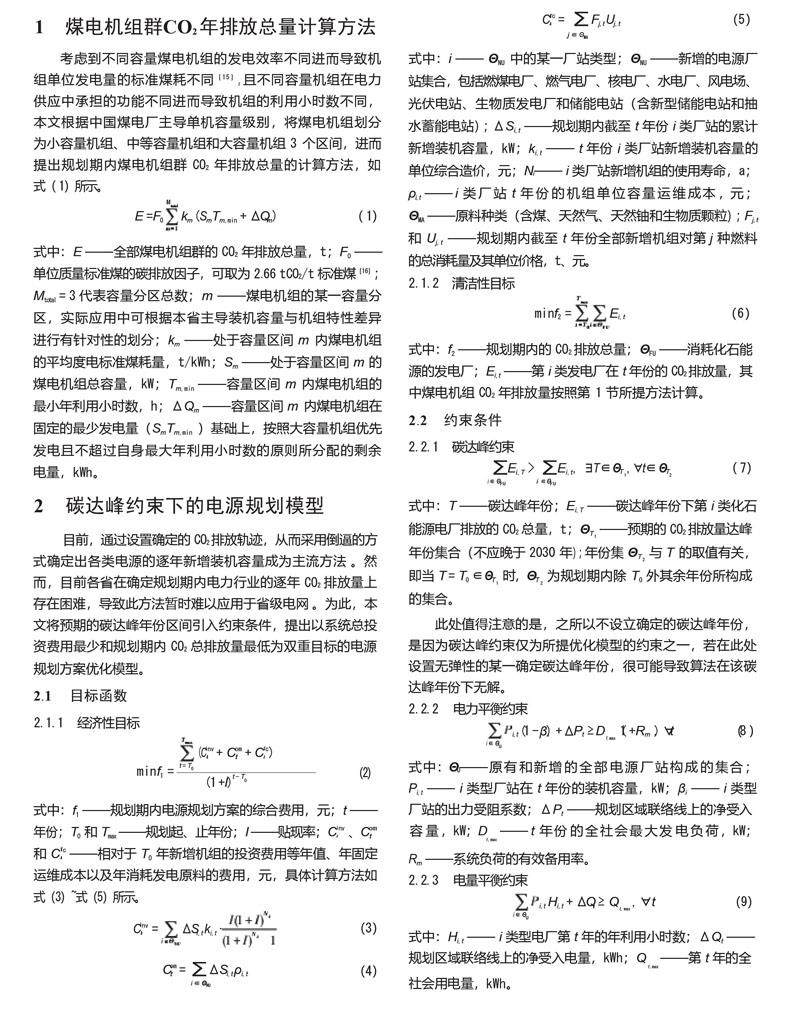 摘 要:电力行业作为最大的碳排放来源,在实现碳达峰目标中扮演举足轻重的角色,而电源规划是调控碳排放的关键路径。为此,该文考虑不同容量机组度电煤耗与利用小时数差异,提出一种煤电机组群CO2年排放总量计算方法,并在此基础上建立碳达峰约束下的省级电源规划多目标优化模型。该模型以系统总投资费用最少和规划期内CO2排放总量最低为双重目标,并将预期的碳达峰实现年份区间引入约束条件。(剩余11600字)