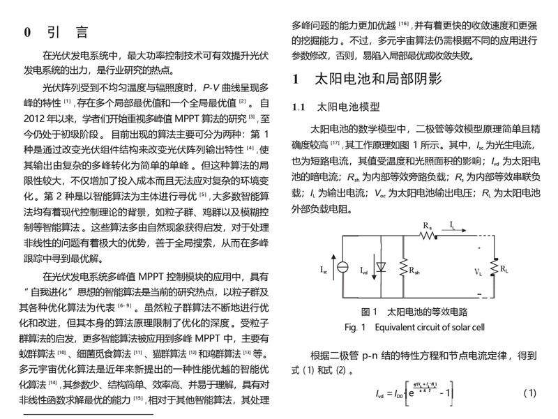 摘 要:针对局部阴影引起的光伏阵列多峰值的输出特性,传统的单峰值MPPT算法已无法适用,为寻得全局最优解,将参数设置简单、易于理解的多元宇宙优化算法原理应用于光伏发电的多峰值MPPT模块中。通过仿真分析,证明了基于多元宇宙优化算法的MPPT控制模型能较快地实现全局最大功率点的跟踪,具有更好的收敛速度和精度。(剩余11312字)