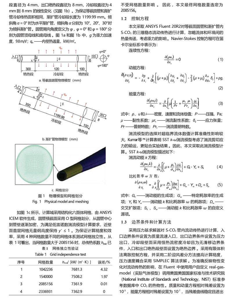 摘 要:采用SST k-ω湍流模型对冷却条件下超临界压力CO2(S-CO2)在等截面圆管、水平渐扩管以及不同倾斜角的渐扩管内的传热特性进行数值模拟。模拟结果表明,在相同换热面积下,相比较于等截面圆管,水平渐扩管的总传热系数提高了32.33%,30°倾斜渐扩管提高了33.12%;水平渐扩管的压降降低了53.87%,30°渐扩管降低了9.86%。(剩余15162字)