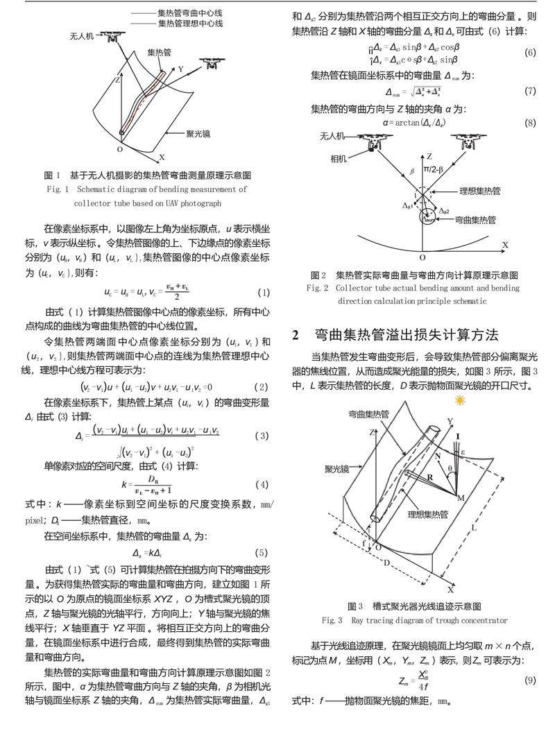 摘 要:槽式太阳能集热管的弯曲变形会造成聚光能量的溢出损失,需要进行测量和分析。提出基于无人机摄影的槽式太阳能集热管弯曲测量方法:采用无人机搭载高分辨可见光相机,实现对槽式太阳能集热管的图像采集;基于边缘检测算法对集热管图像进行处理,最终获得集热管的弯曲变形量。基于光线追迹理论建立槽式聚光器聚光过程数学模型,推导弯曲集热管的溢出损失计算公式。(剩余7845字)